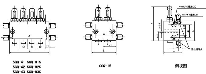 一、概述 SGQ系列双线给油器适用于公称压力为10MPa的双线式干油集中润滑系统中,作为一种计量给油装置。它在二条供油管交替的供油压力作用下,由供油压力推动活塞给油,完成向各润滑点定量分配润滑脂的功能。 SGQ双线给油器有单向出油和双向出油二种结构形式。单向出油的给油器只有下给油孔,活塞正反排油时都由下给油孔向润滑点供送润滑脂;双向出油的给油器有上、下给油孔,活塞正反向排油时由上下给油孔交替向润滑点供送润滑脂。给油器可以从指示杆的动作直接观察到给油器的工作情况,还可以通过调节螺丝在规定范围内方便地调整各给油口的给油量。