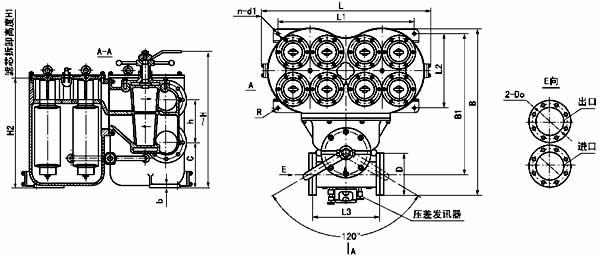 法兰标准:GB573-65(可根据需要确定):DN100、150-3 组滤芯组件 DN200-4 组滤芯组件;压差发讯器为选配件。